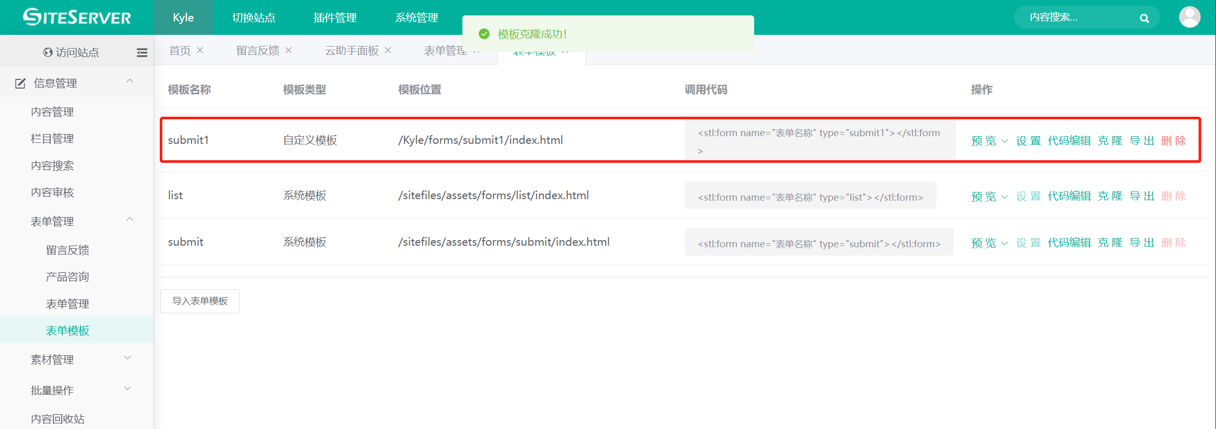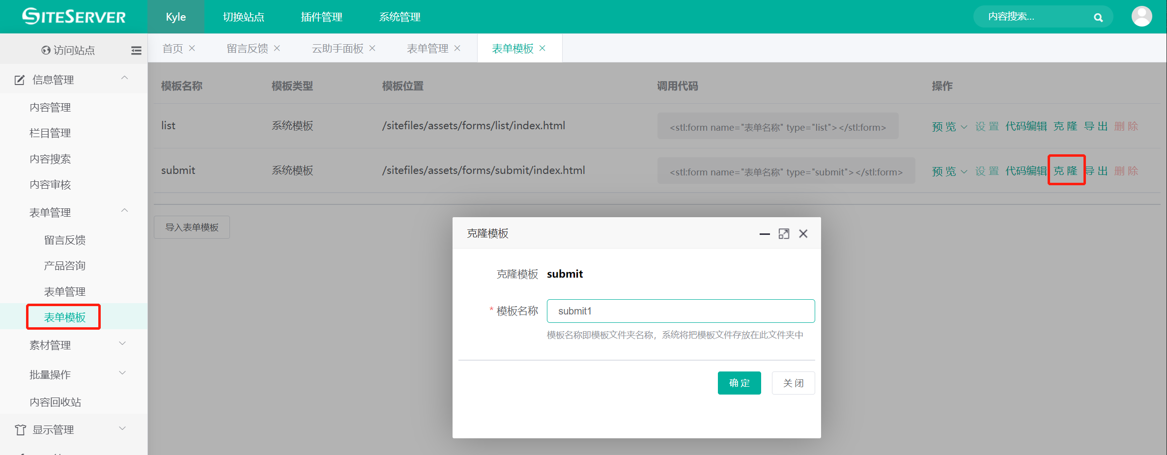 输入自定义模板名称后点击确定,系统将在站点目录下创建表单模板文件夹并出现克隆的表单模板: