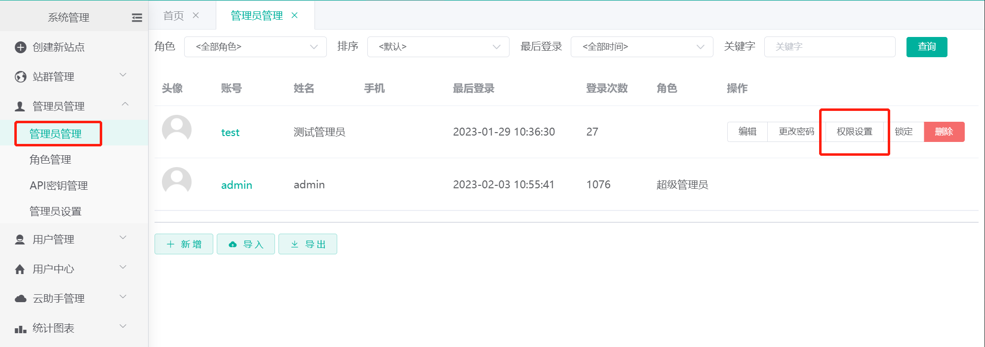 点击管理员列表右侧操作栏下的 权限设置 按钮,系统将弹出权限设置窗口:
