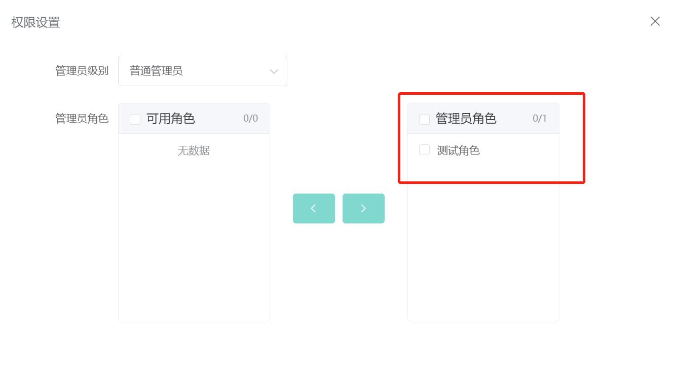 在权限设置窗口中勾选左侧的可用角色,并点击中间向右按钮,将角色转移至右侧管理员角色: