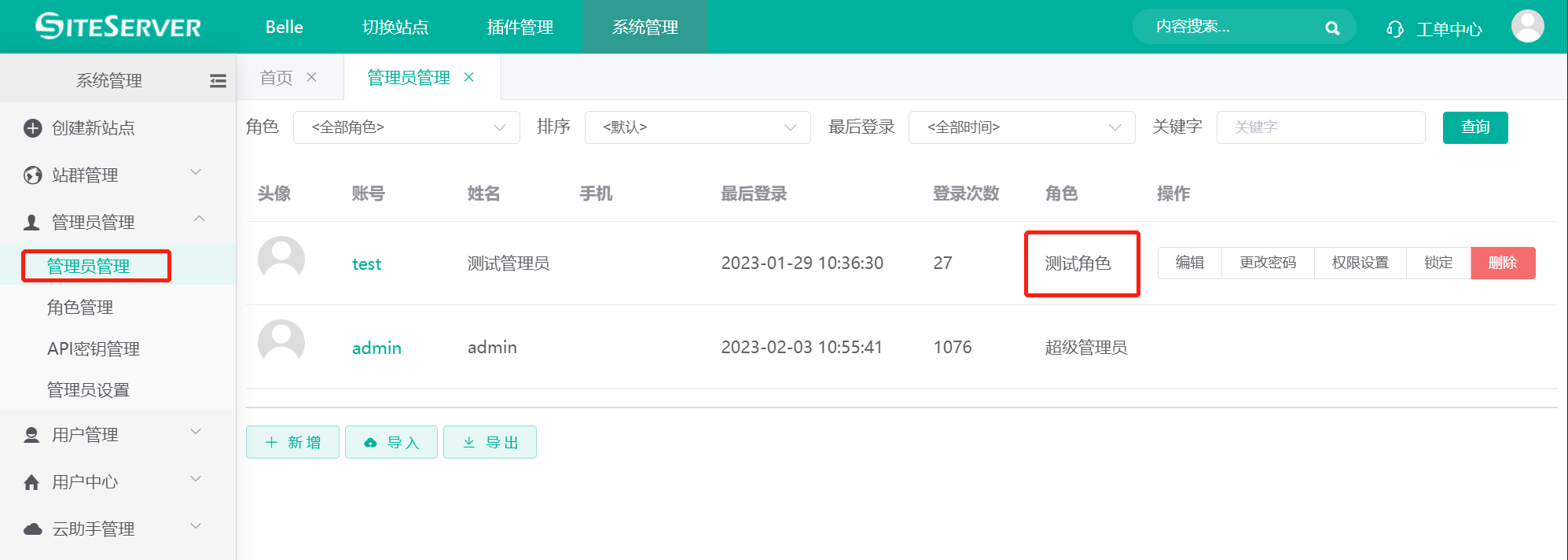 之后点击确定按钮保存,我们将在管理员列表角色一栏中看到刚设置的角色: