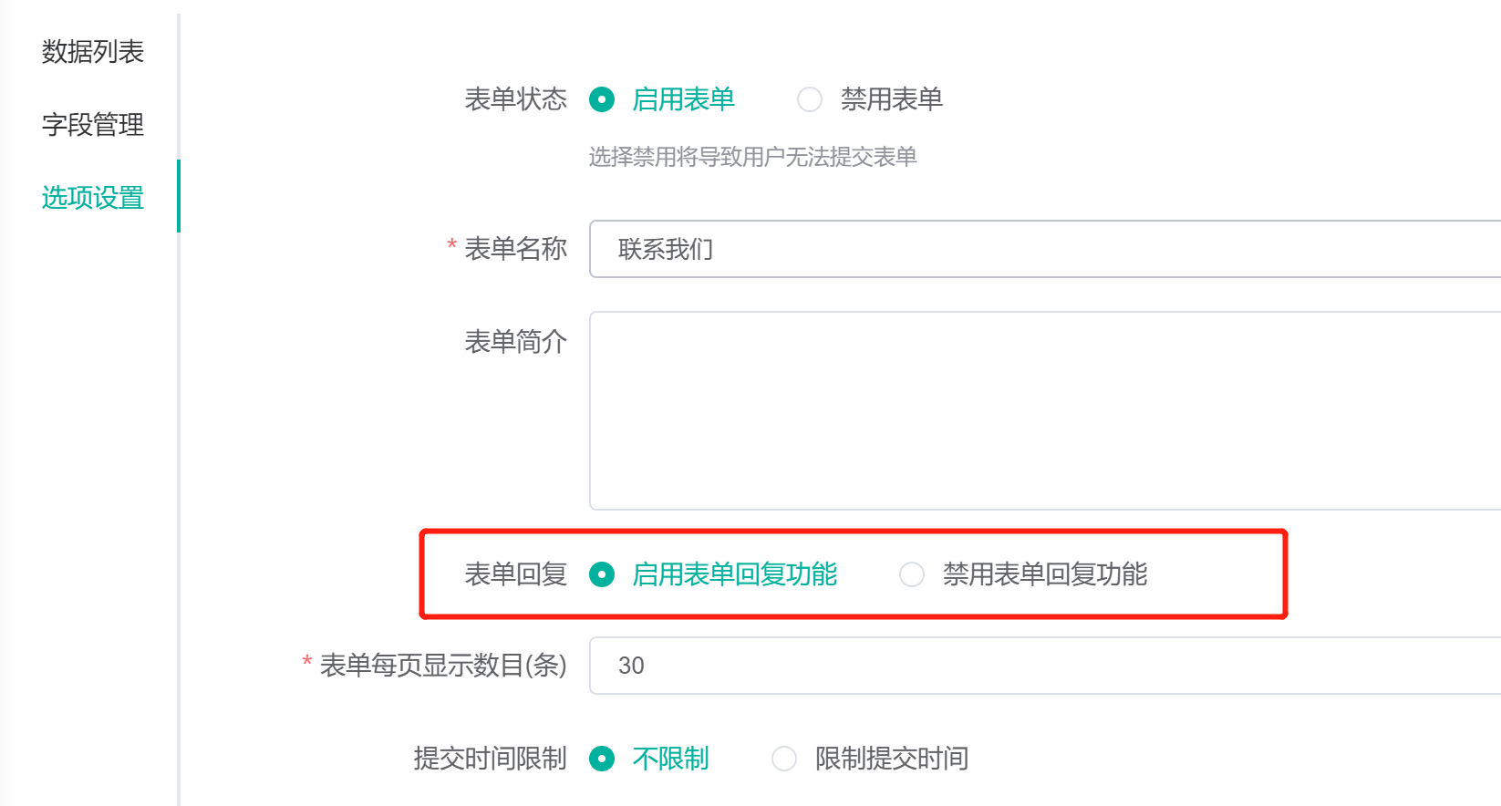 当前台用户提交的表单需要通过管理员进行回复并将数据显示到前台时,我们将需要启用表单回复功能。