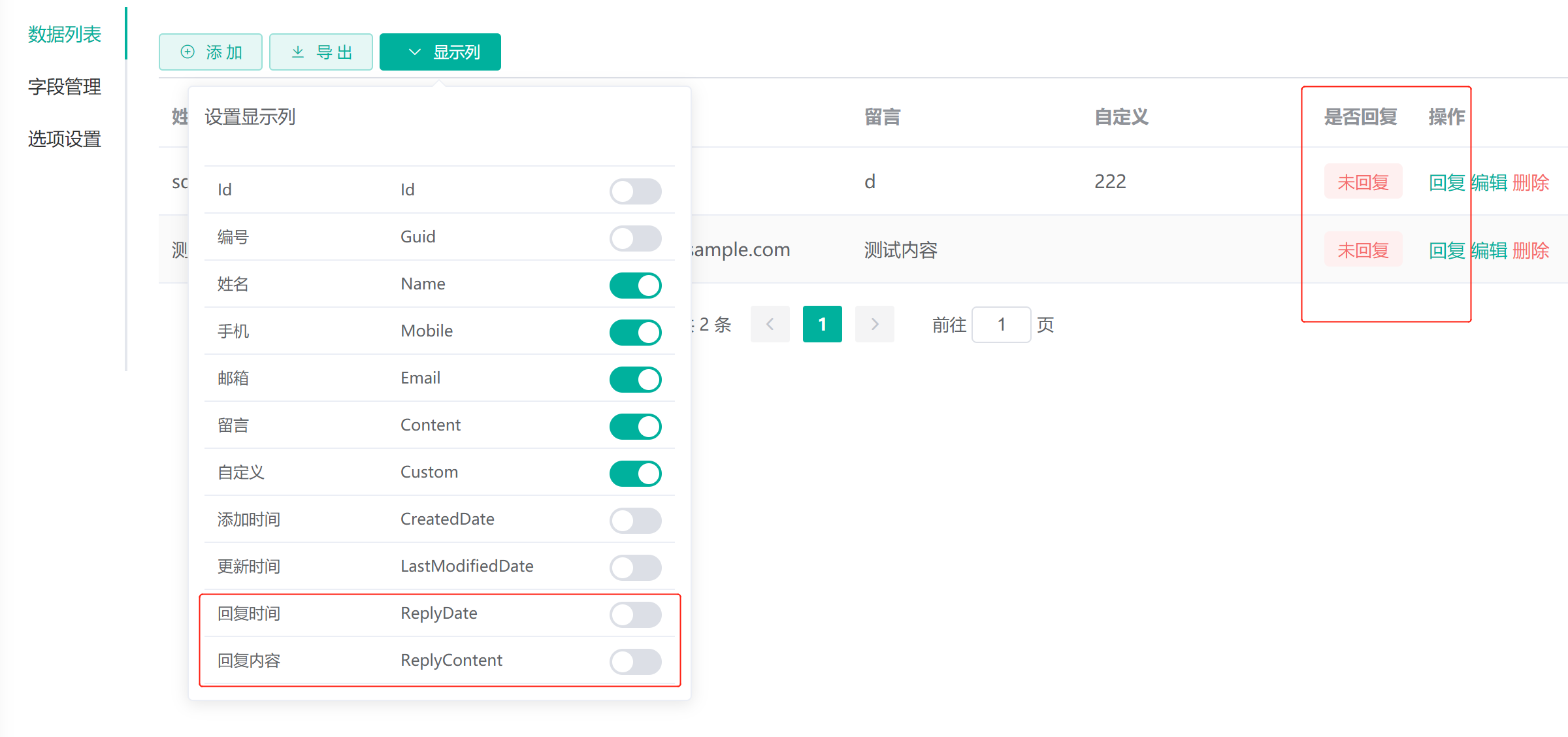 启用表单回复功能后切换到 数据列表 界面,列表右侧将显示本条数据的回复状态,同时显示列中将新增可选项 回复时间 以及 回复内容。