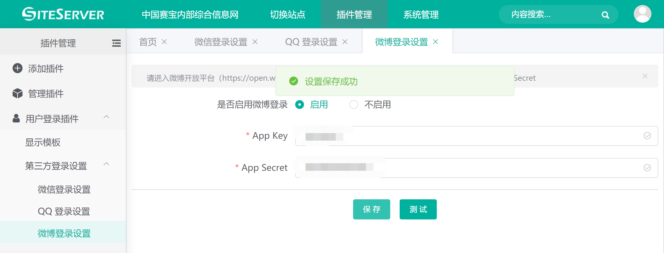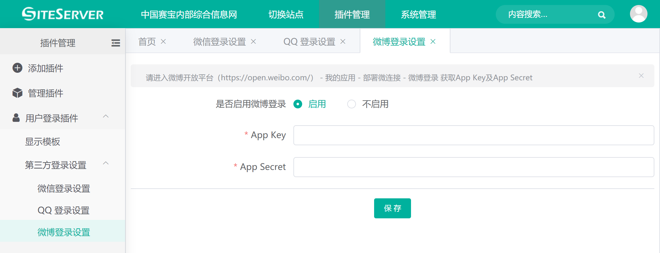 集成微博一键登录需要在登录插件中设置微博登录参数,进入用户登录插件 -> 第三方登录设置 -> 微博登录设置: