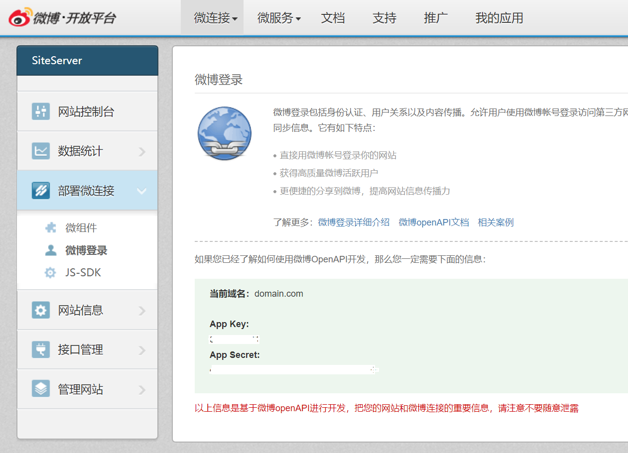 App Key 以及 App Secret 值需要从 微博开放平台 (opens new window) 获取,进入微博开放平台,找到我的应用,点击部署微连接,微博登录: