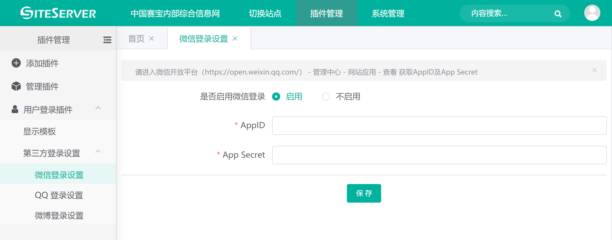集成微信一键登录需要在登录插件中设置微信登录参数,进入用户登录插件 -> 第三方登录设置 -> 微信登录设置: