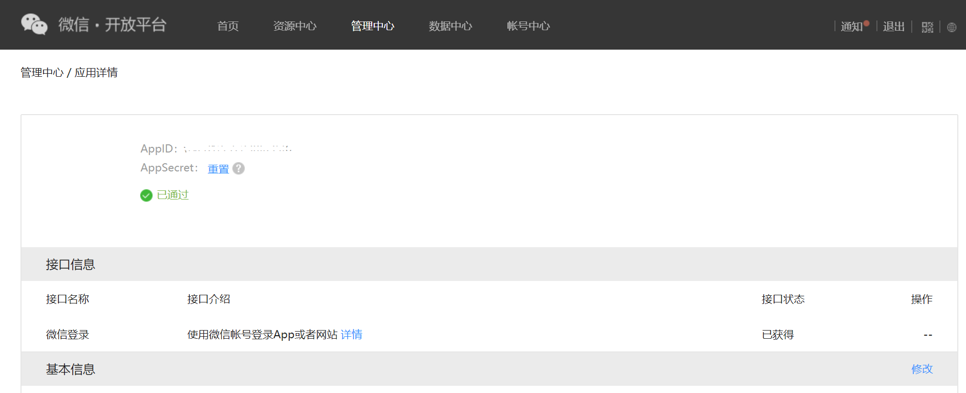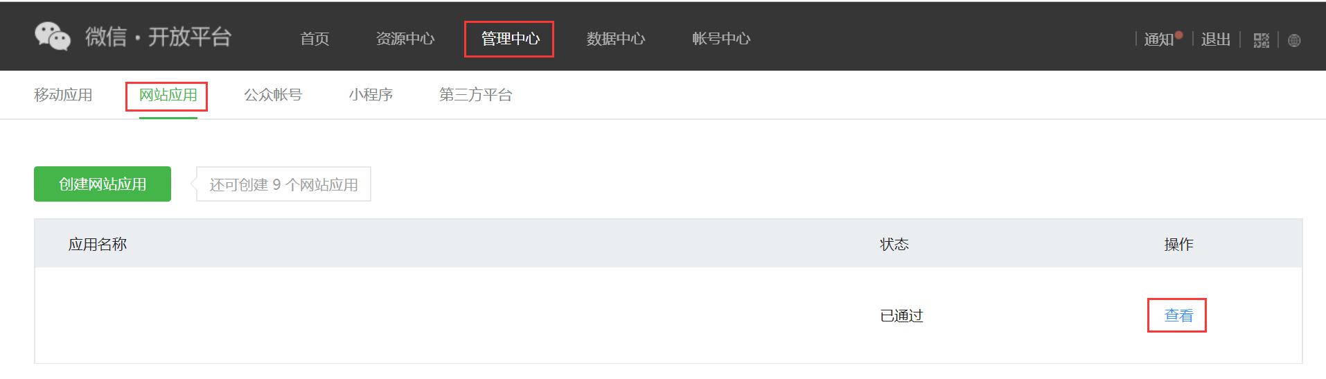 AppID 以及 App Secret 值需要从 微信开放平台 (opens new window) 获取,进入微信开放平台,找到管理中心,点击网站应用: